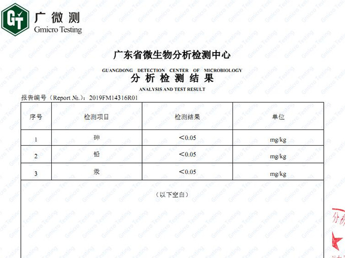 我司研發(fā)的植物精油甲醛凈產(chǎn)品不同于市場上傳統(tǒng)的光觸媒產(chǎn)品,除了在施工過程中不需要光照外,在除甲醛效果上遠遠優(yōu)于傳統(tǒng)光觸媒產(chǎn)品。此次送檢的樣品批次為9月份新產(chǎn),經(jīng)過廣微測的嚴(yán)格無毒檢測證明,所有重金屬和有毒成分含量幾乎為零。也就是說甲醛凈為無毒安全產(chǎn)品。以下為檢測報告截圖: